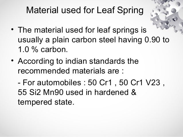 Material used for leaf spring. C 0 51 0 59 cr 0 60 0 80 si 1 20 1 60. Good corrosion resistance and electrical conductivity. A leaf spring is a simple form of spring commonly used for the suspension in wheeled vehicles originally called a laminated or carriage spring and sometimes referred to as a semi elliptical spring elliptical spring or cart spring it is one of the oldest forms of springing appearing on carriages in france in the mid 17th century in the form of the two part elbow spring as the illustrated.